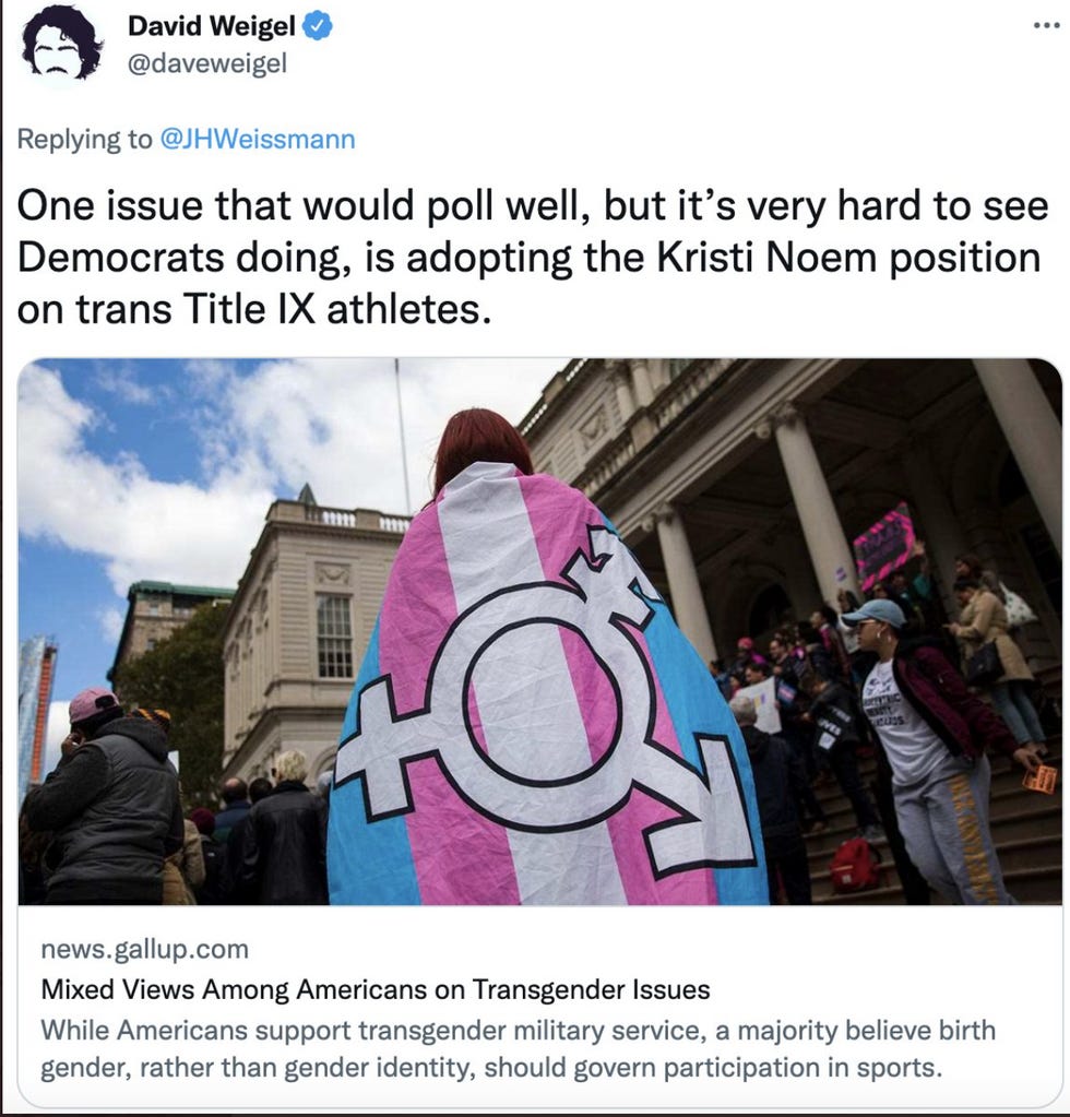 Weigel later deleted his tweet because people got so touchy about it. He claims he was just being “glib” and would never seriously suggest that Democrats kick trans people out of the coalition. He was just pointing out that letting trans kids participate in sports according to their gender identity “polls badly,” and Democrats would normally cave on the issue. But he’s certain they won’t, even if he subtly reminds them of how bad the numbers are for this issue.