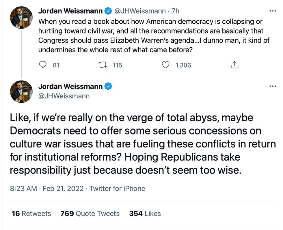 WEISSMAN: When you read a book about how American democracy is collapsing or hurtling toward civil war, and all the recommendations are basically that Congress should pass Elizabeth Warren’s agenda…I dunno man, it kind of undermines the whole rest of what came before?