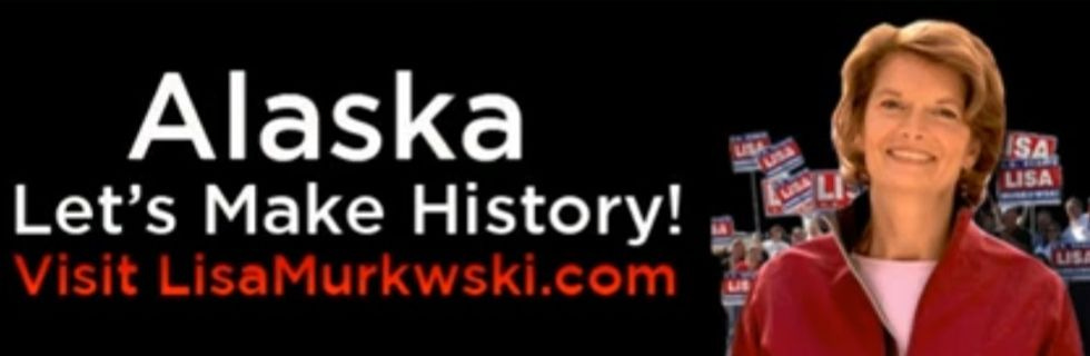 You see, Murkowski was originally appointed to the Senate in 2002 to serve out the remainder of the term of her daddy, Frank Murkowski, who'd gone and gotten himself elected governor of Alaska. Nothing weird about that, Alaska voters decided, and so they reelected her in 2004. Then came the Tea Party Electoral Fuckquake of 2010, and Murkowski lost the primary to compulsive liar, jerkwad, and Sarah Palin pal (but we repeat ourselves) Joe Miller. In a bold gamble that Alaskan voters as a whole were less shitheaded than Alaskan Republican primary voters, Murkowski decided to run a write-in campaign for reelection. Murkowski's campaign faced the difficult challenge of teaching Alaskans how to find the write-in portion of the ballot and write her name correctly. It probably didn't help that her first write-in campaign ad -- which was otherwise cutely retroish -- misspelled her name: