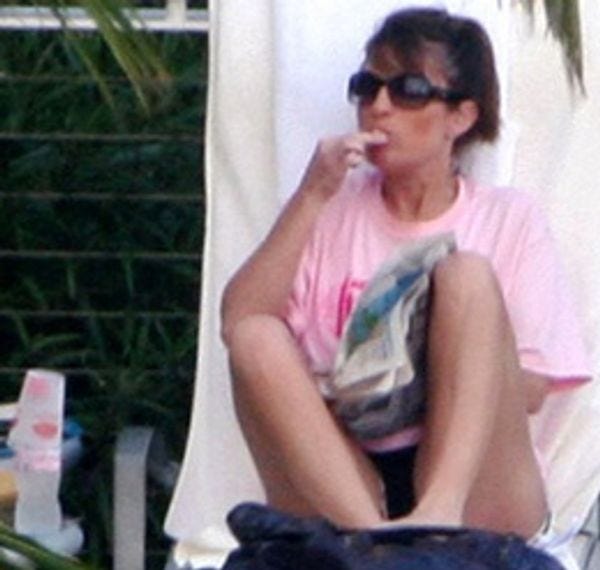 Uh-oh, guys, no one wants to pay money to yapping imbecile Sarah Palin for her job of "doing nothing" anymore! RLY SAD BUT TRUE: her insipid, publicly-funded reality teevee show about naked grizzly bear hunting in Alaska or whatever was not renewed for a second season, so she is apparently trying to shop around a new show starring Todd Palin pissing moose figurines into the snow. Absolutely none of the networks want to buy it, though!