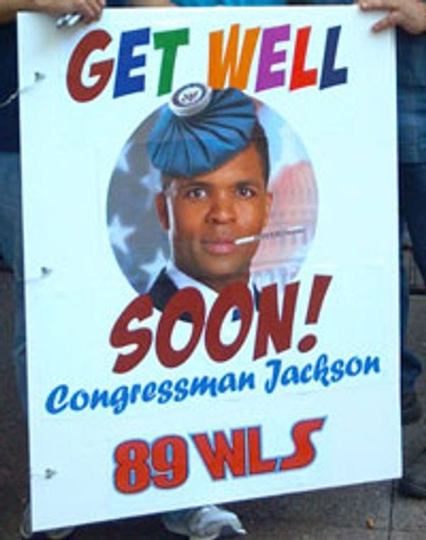 Were you aware that Jesse Jackson, Jr., son of the famous Jesse Jackson that you all know from civil rights and such, is a Congressman, from Barack Obama and Rod Blagojevich's socialist Chicago paradise? He is! Did you know that he hasn't been in Congress or seen by anyone since June 10? That is also true, and the jokesters at WLS, Chicago's favorite all-right-wing talk radio AM station, are having some fun with this fact, like with the silly get well card at right. He is supposedly suffering from "exhaustion," which as far as we were aware is code for "Demi Moore likes to do whip-its" and is not a recognized medical condition. This story should stay hilarious, so long as the rumors that he tried to kill himself continue to not be true!