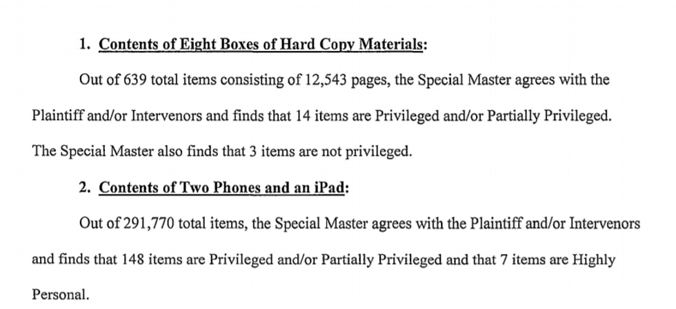 "Out of 639 total items consisting of 12,543 pages, the Special Master agrees with the Plaintiff and/or Intervenors and finds that 14 items are Privileged and/or Partially Privileged. The Special Master also finds that 3 items are not privileged."