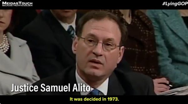 Samuel Alito, the insolent little big tough guy whose lazy My First Judicial Opinion caused all of this, said " Roe v. Wade is an important precedent of the Supreme Court" and that "when a decision is challenged and it is reaffirmed, that strengthens its value."
