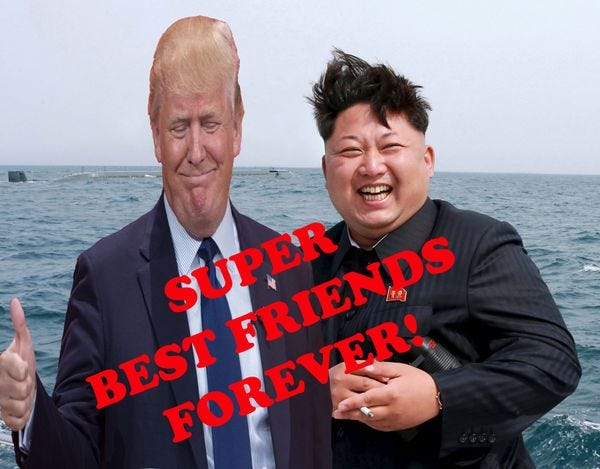 Well isn't that just precious? One trigger-happy lunatic wants to be besties with the another loud-mouthed maniac! Never before have geopolitics and the threat of thermonuclear war ever held the potential for such a beautiful friendship! It's just like ol' Ronnie Reagan and Gorbachev, but with better hair and better walls!