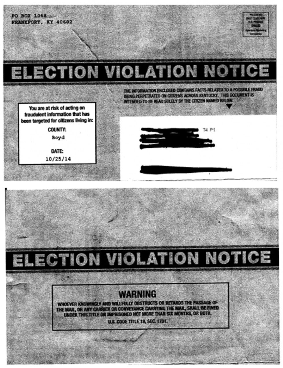UPDATE: Late Friday afternoon the Grimes campaign filed aninjunction against McConnell, calling it a violation of KRS 119.155, which forbids intimidating or attempting to intimidate any voter into not casting a ballot. Rick Hasen at the Election Law Blog thinks that the flier might be sneaky and underhanded but does not rise to the level of illegality. In any case, it is unclear what Grimes can do besides get the McConnell campaign to not mail any more of the damn things, and maybe publicly take a piece out of hisshellhide before Tuesday.