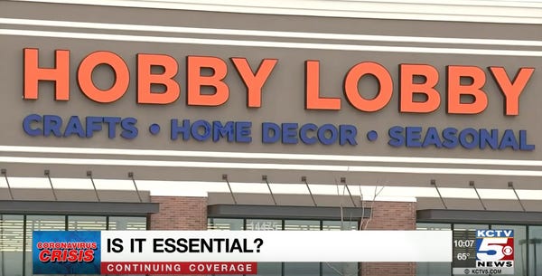 Despite literally having the word “hobby" in its name, Hobby Lobby has tried to rebrand itself as an “essential" business. A hastily made sign on the window of one store claimed it's now operating as an essential business because it sells “PPE masks, educational supplies, office supplies, and various components for at-home small businesses." That's absurd. Bars and restaurants offer food, which is essential, but they're all closed except for takeout and delivery.