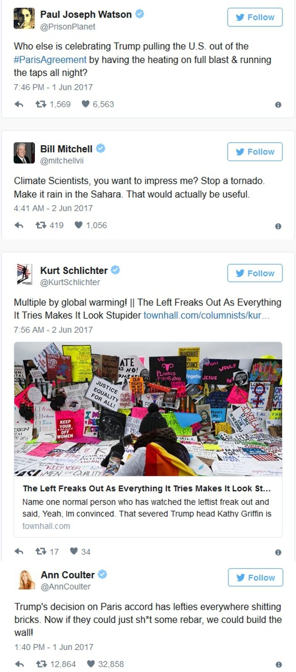 Vanity Fair's Tina Nguyen took a look at rightwing Twitter and speculated that much of the impetus for Trump's abandonment of Paris was simply to troll liberals, since wingnuts may not have given much thought to science or energy policy, but they sure were happy yesterday: