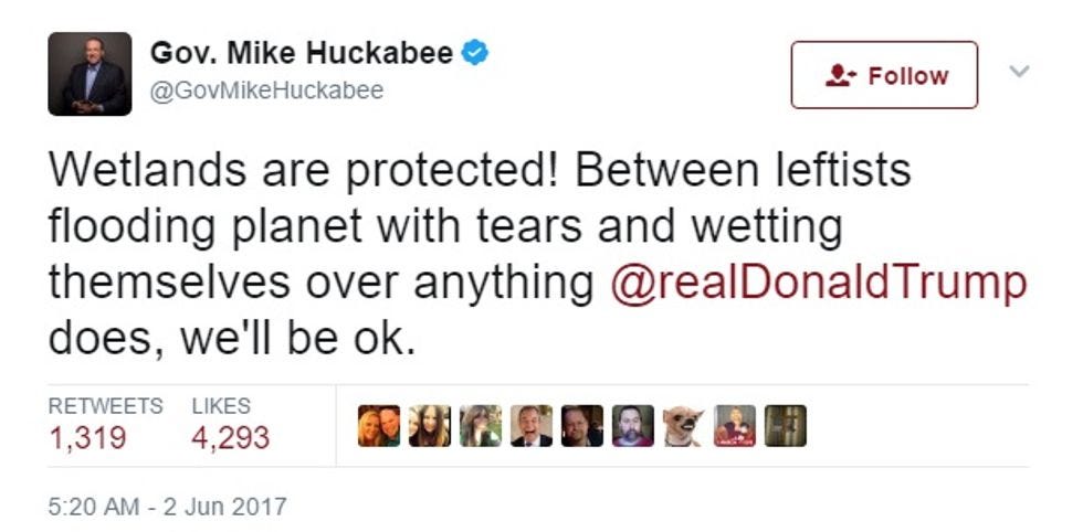 Mike Huckabee continued his record-breaking streak of never-funny jokes on Twitter with this hilarious observation on environmental concerns: