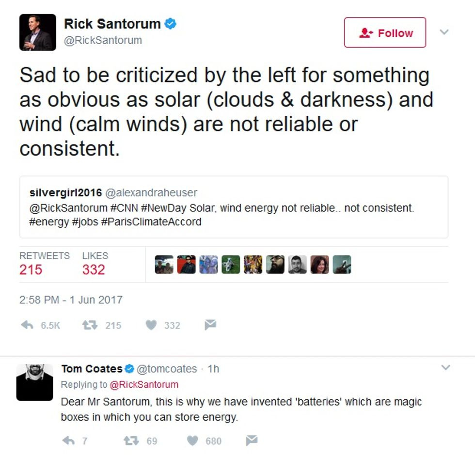 Not everyone gathered around a tree sapling and sang Kumbayah, of course. On CNN, twice-failed presidential candidate Rick Santorum supported leaving the Paris agreement and explained you can't trust green energy because it's so terrible. Solar and wind, you see, are "not reliable, not consistent":