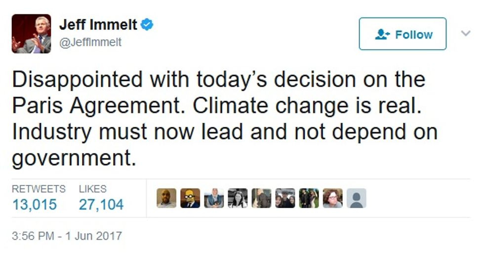 It's not just crazy liberal governors and mayors, of course -- a whole lot of corporations think rising sea levels and extreme weather events might not be so good for business, and plan to continue their own efforts to use cleaner energy. Before Trump announced his decision, 25 companies bought full-page ads in national newspapers urging him not to, and after the announcement, Tesla Motors/SpaceX CEO Elon Musk announced he'd resign from a presidential economic advisory council, as did Robert Iger, the CEO of Disney (which includes the ABC TV network). Jeff Immelt, the CEO of General Electric, said that if the president is going to be a doodyhead on climate, then businesses will have to do better: