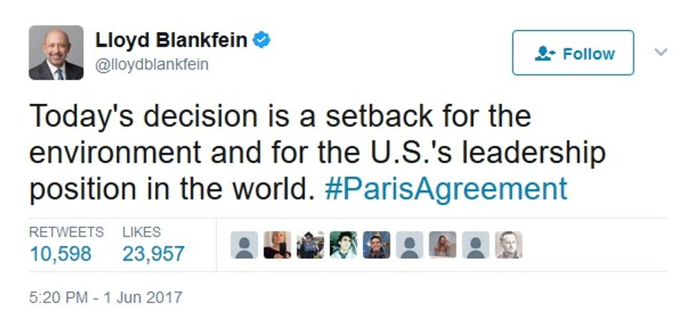 And so on -- other businesses pledging to keep working to fight climate change included Google, Twitter, Facebook, Apple, Microsoft, Amazon, and IBM. And then there were the surprises: Lloyd Blankfein, the CEO of Goldman Sachs, got on the Twitter machine for the very first time ever to take exception to Trump's move.
