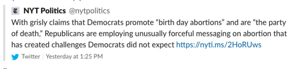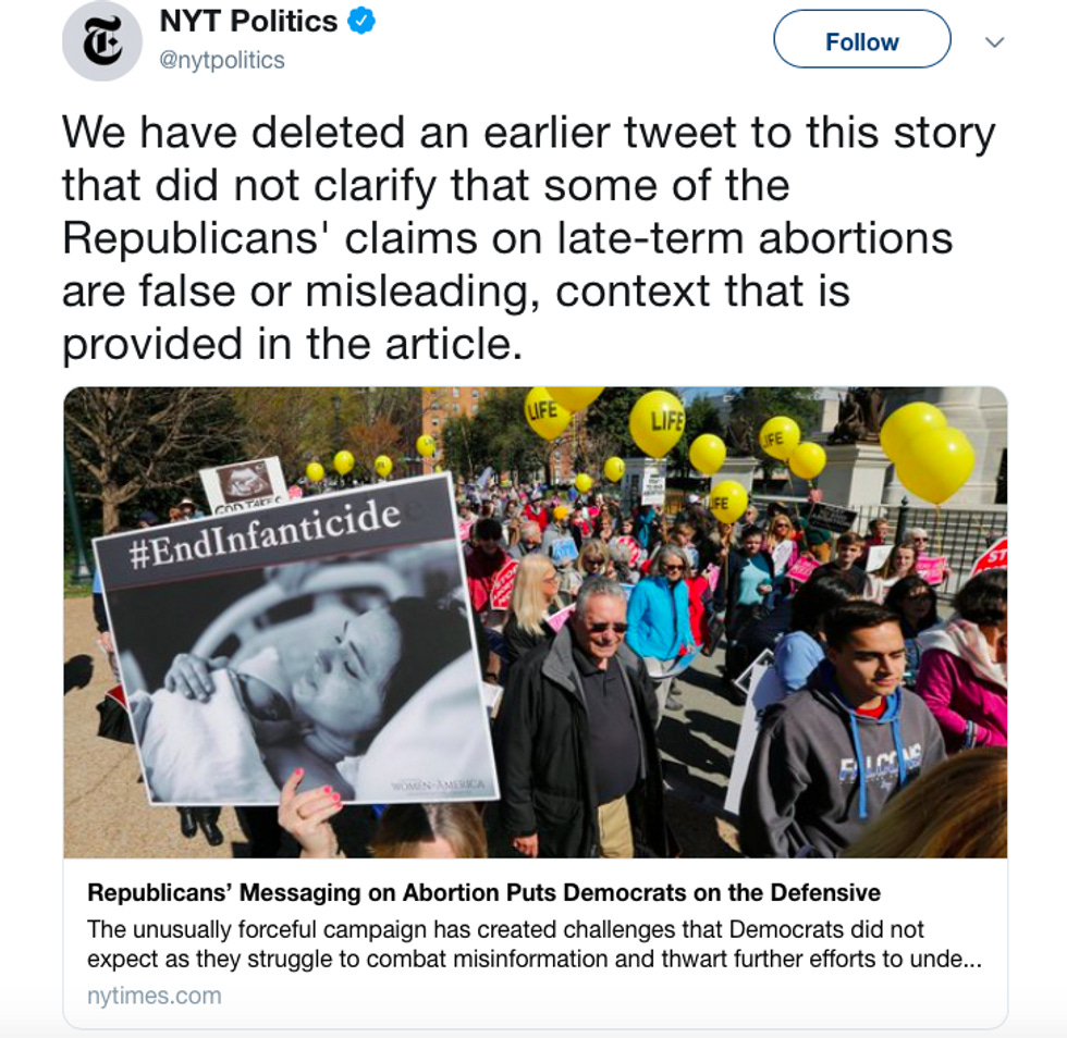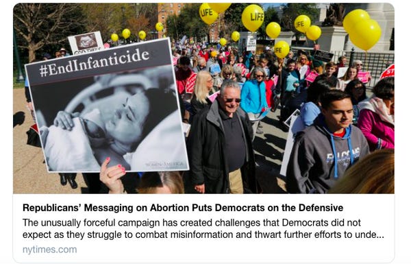 We're still treated to the appalling photo of a mother and her newborn child with the hashtag #EndInfanticide. (That's actually easier than #FreeTibet because there is no infanticide to end.) The story is still presented as one of Republican strength and Democratic weakness. There is also a larger problem with the Times's political reporting: Their stories detail the Republicans' vicious attacks against elected Democrats or liberal activists specifically but not the "civilians" who conservatives viciously malign. This is a distinct and consistent contrast with how Republicans are covered.
