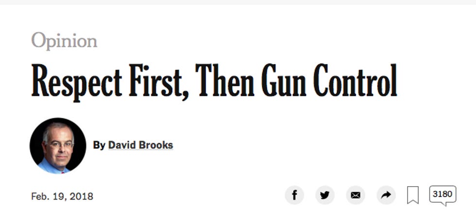 Where's the call for "respect" for women who have abortions? According to the Times, accusing women of Hitler-style brutality is apparently working. Brooks wrote an op-ed last year where he pretended he was a Democratic consultant wondering if rigid support for abortion rights came at too high a political cost. Even after Sandy Hook, Parkland, and now Denver, there's no implication that the GOP's unyielding opposition to even sensible gun control costs them anything or is an obstacle to wooing moderates.