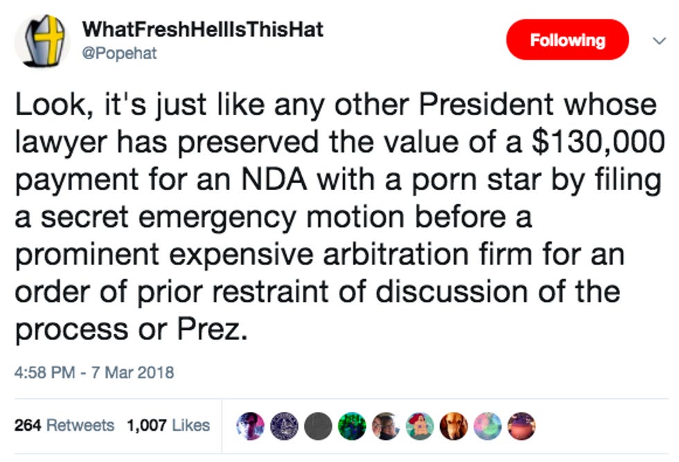 Right! Yesterday we told you about the lawsuit Daniels filed against Trump to get the Non-Disclosure Agreement thrown out. Because we were so busy LOLing at Michael Cohen's terrible drafting, we didn't get to talk about Cohen bringing an arbitration claim against Daniels on February 27, 2018.