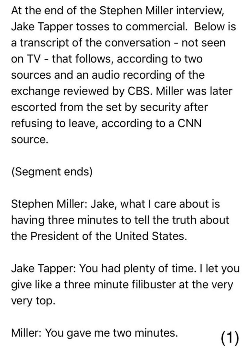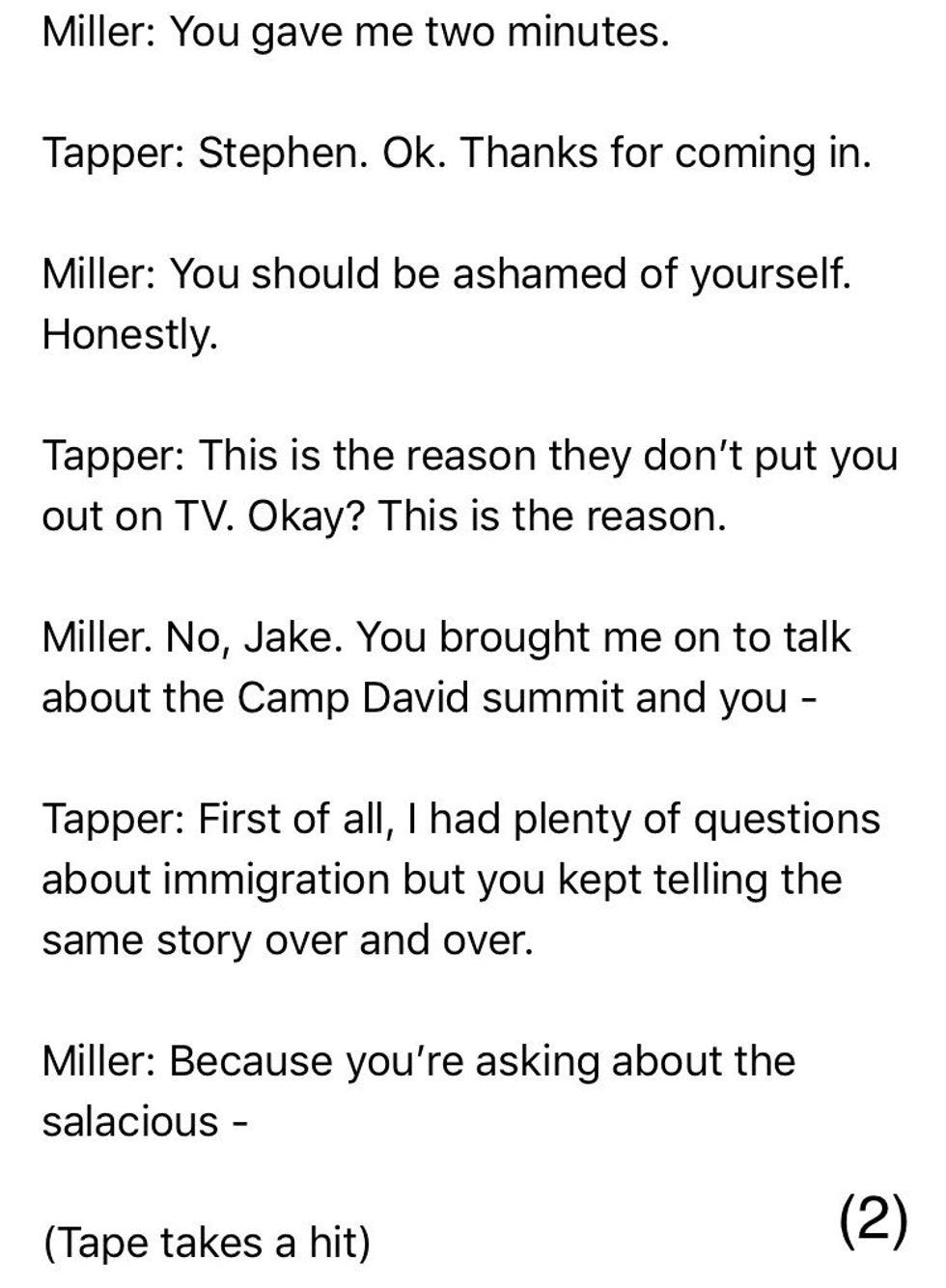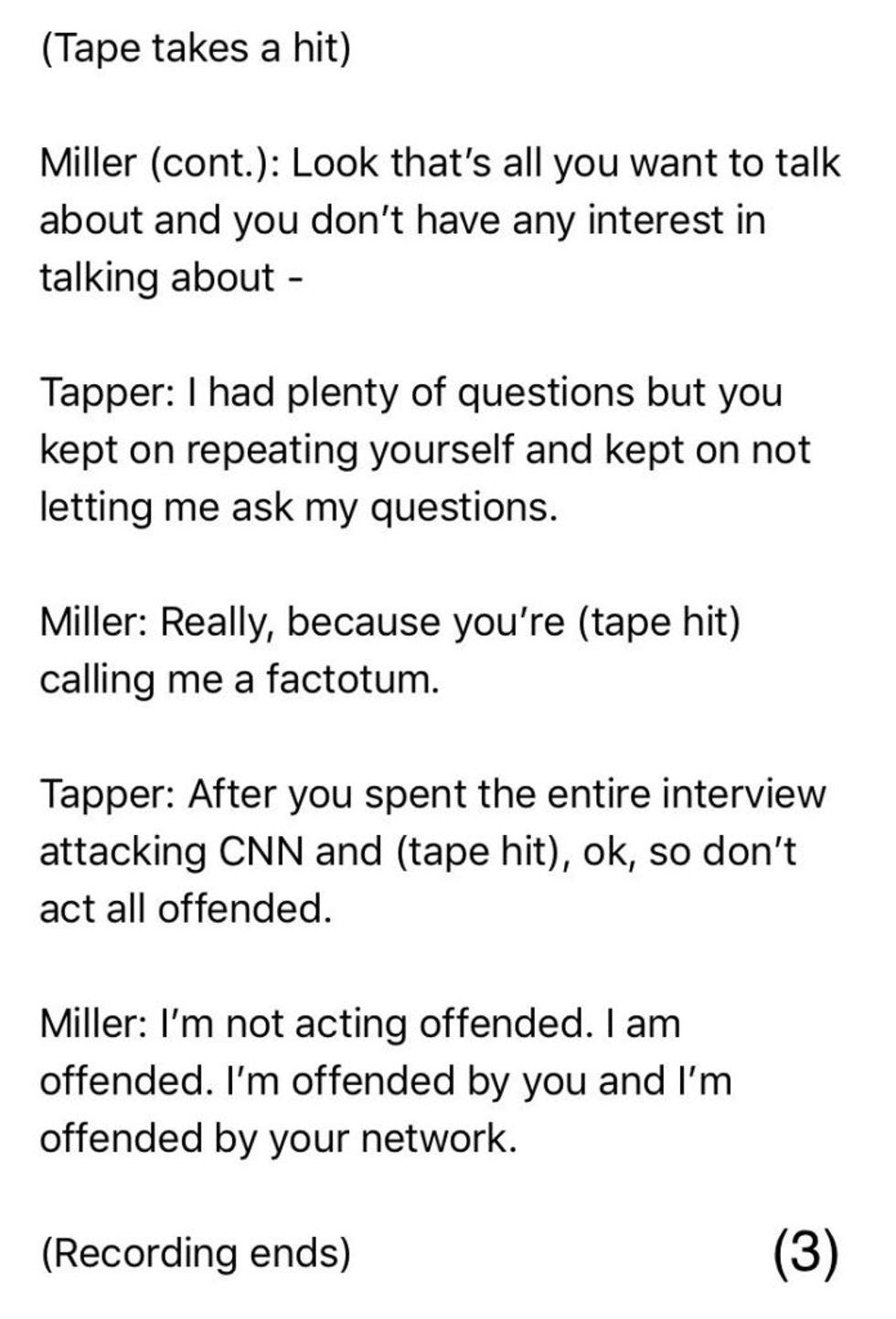 Thanks to Arden Farhi, a producer at CBS News, we have a transcript of Tapper continuing to sew Miller's eyeballs onto a pooka-eyeball-shell necklace, and also: