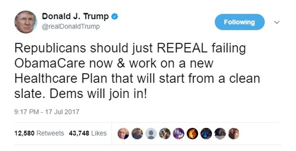 Yes, that would involve government regulation of healthcare, but wouldn't be socialism, just because. Susan Collins has similarly said Republicans should start from scratch, with hearings and amendments and so on, rather than hastily trying to cram something written secretly through Congress. John McCain, whose recovery from surgery to remove a blood clot in his head delayed a vote on the Senate bill, also called for getting rid of Obamacare, which of course is still the worst, but at least doing it the normal way: