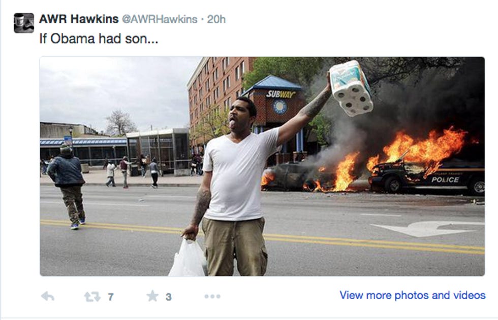 Say, Wonketeers, it's getting a bit chilly in here, let's warm up by huddling next to this scorching hot take from AWR Hawkins' own Twitter feed, the better to understand how the oppressed, pleated-khakis-wearing white men of America see every person of color in Baltimore right now.