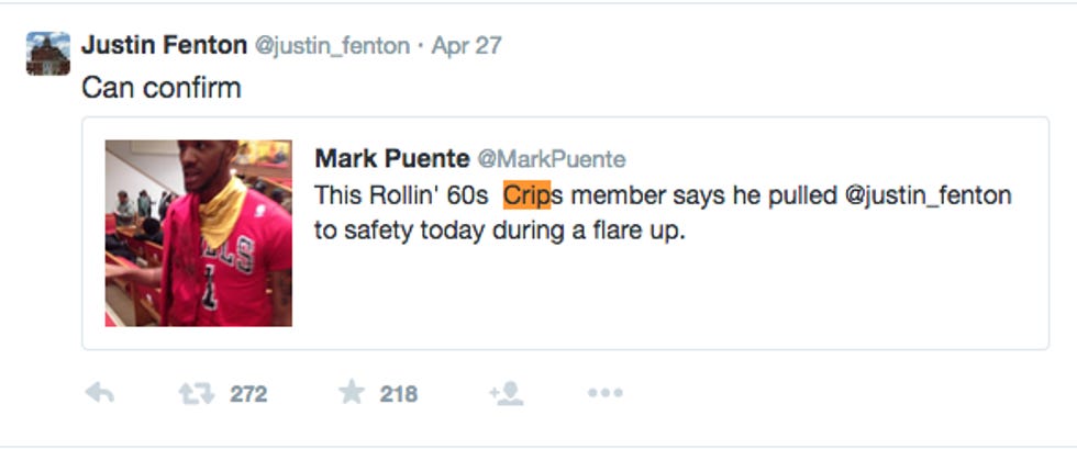 And then Justin Fenton responded that no, he hasn't been all over the place with this story; he's consistently been saying that a group of self-identified Crips was protecting him. Let's take a quick look at Fenton's Twitter feed from the day before to see if that's true.