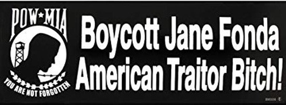 Here is the semi-baffling video to remind you to be mad about a thing that sells bumper stickers 46 years later, because if it weren't for Jane Fonda, Rambo could have easily won in Vietnam, as we all know today: