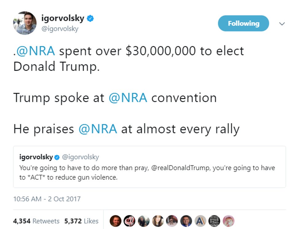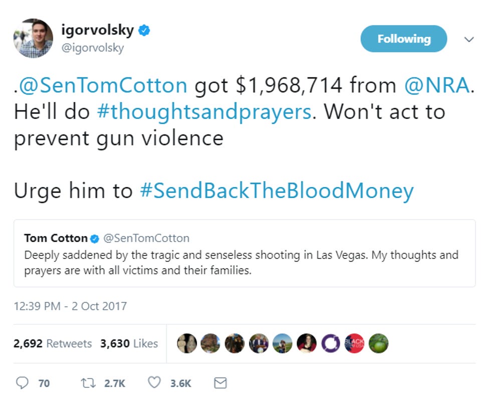 If you didn't know, Igor Volsky's Twitter account is a must-read on mass shooting days (we have so many of them!), as he retweets the thoughts 'n' prayers of Republican politicians and simply notes how much blood money they've taken from the NRA. Scroll down and see if you find your favorite GOP asshole!