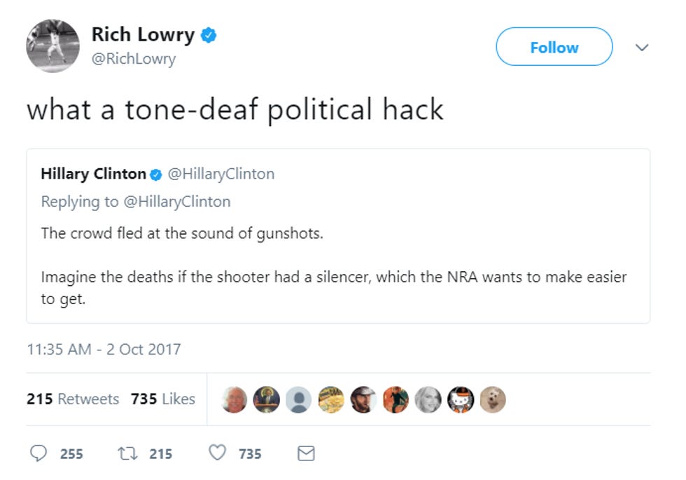 National Review editor Rich Lowry is having ANGRY STARBURSTS at Hillary Clinton, for saying the NRA's a piece of shit for pushing gun silencer legislation right now: