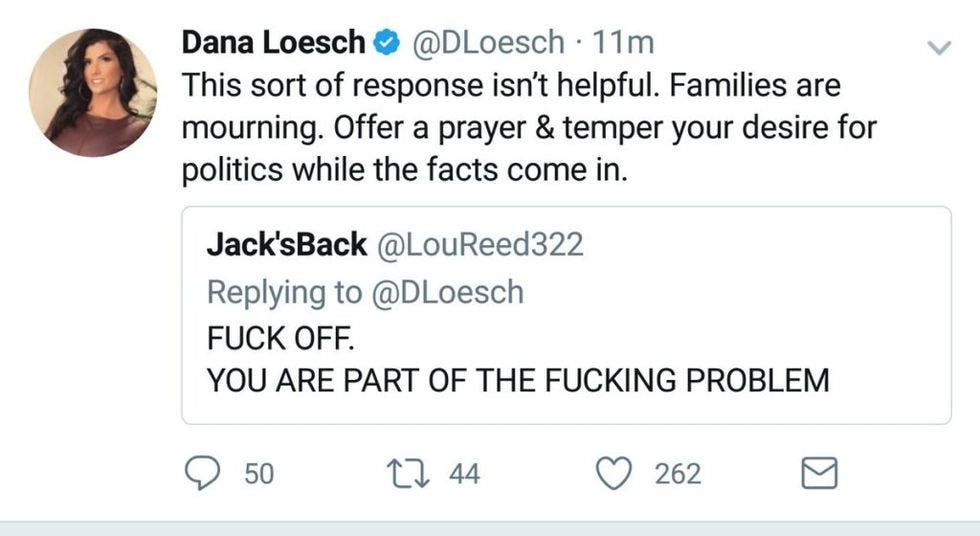 REMINDER: Dana Loesch is a verifiably bad person, especially when it comes to her NRA promotion. While we do not endorse people wishing violence upon her on Twitter, we would heartily endorse her deciding to go fuck herself right about now.