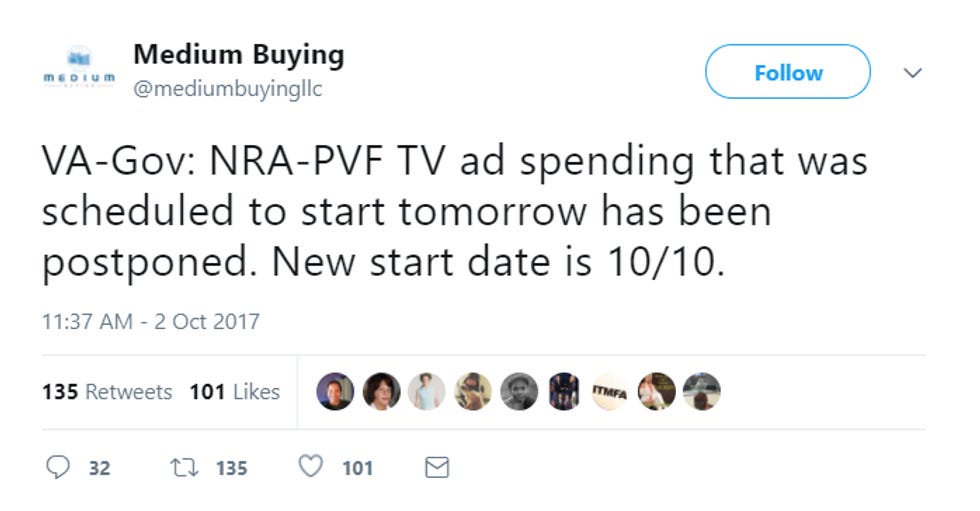 No really, this is the NRA's grand gesture. As Oliver Willis notes at Shareblue, the NRA is backing Republican Ed Gillespie in Virginia's gubernatorial race. So, in honor and reverence for the 58 (or more) lives lost after a 64-year-old domestic terrorist used a bunch of the NRA's favorite penis guns to inflict maximum carnage upon innocent people, the gun rights group will refrain from running hate ads about how Gillespie's opponent is a pussy who doesn't even recognize your God-given right to murder everyone with guns FOR A LITTLE OVER A WEEK. Then they'll rev the engines right back up, which will signal the GOP that the "too soon" phase is over, and we are now in the "let's all just move on and Make America Great Again" phase. (Yes, we will have skipped the phase where it's appropriate to talk gun control, because THERE AIN'T SO SUCH PHASE.)
