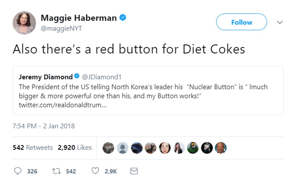 While we think this is actually really fucking serious and if there was ever an excuse for Mike Pence and the Cabinet to shove Article 25 up Trump's ass, this it it, we acknowledge Maggie Haberman right here, making an attempt at a light joke: