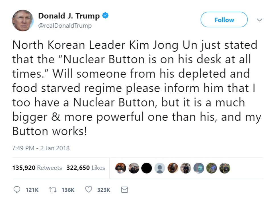 Great. The "president" is talking about his "button," because he (allegedly) has a bigger "button" than Kim Jong Un, and we are supposed to believe this because ...