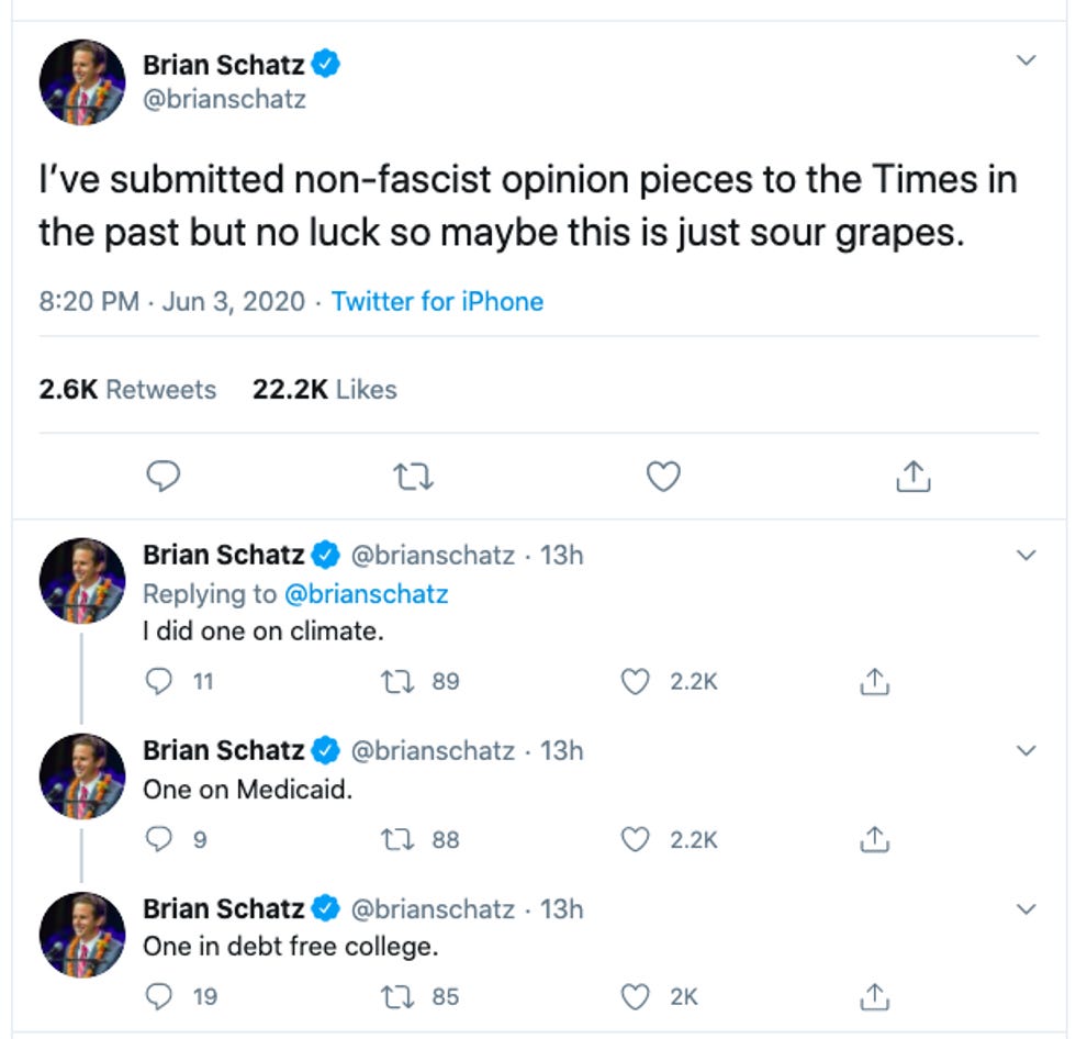 As many commentators pointed out, the paper may have an obligation to write about the arguments that politicians are making, but that's not the same as handing the microphone over to someone advocating grossly immoral and likely illegal positions. The Times could have written its standard, bothsides article about Cotton's arglebargle, fascist-worshipping tweets, with constitutional lawyers pointing out the legal and practical challenges and military figures such as James Mattis explaining how deeply dangerous and unwise this position is. They didn't have to let Tom Cotton pretend to be concerned about "poor communities that still bear scars from past upheavals," while advocating for the exact policies they're fighting against.