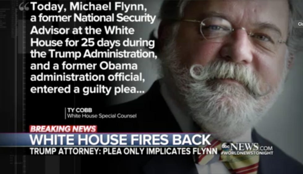 The president's most excellent lawyer, Ty "This Is Fine" Cobb, admits that they sent Flynn -- “it would have been political malpractice not to discuss sanctions” -- and he's only sad that Flynn lied about it to the White House and the FBI. So, to summarize: