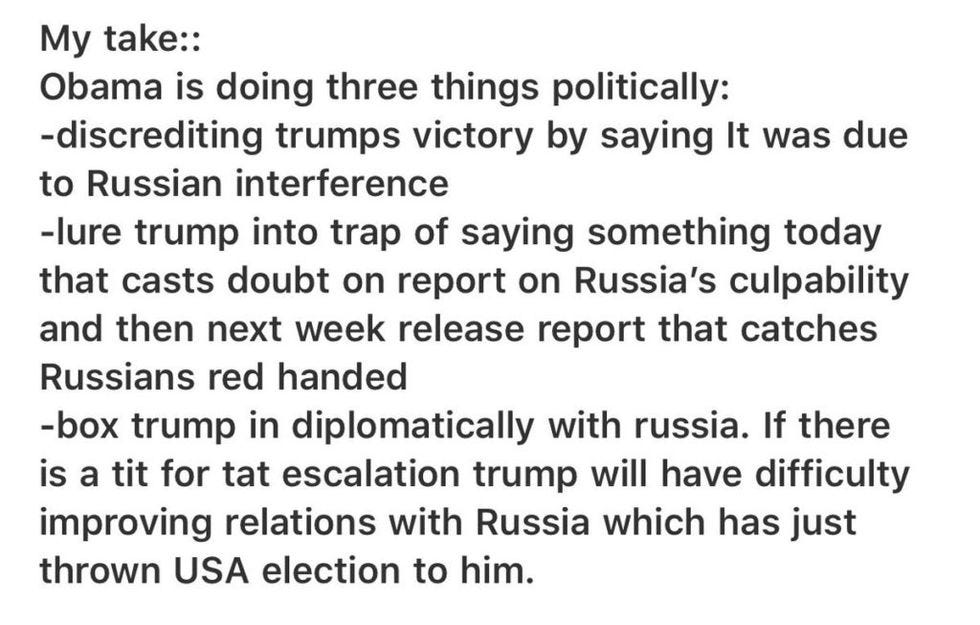 On December 29, the Obama administration expelled 35 Russian operatives from the US and imposed sanctions on 4 high-ranking Russian officials in response to Russian hacking of the 2016 election. Which seemed perfectly reasonable, except in Trumpland where everyone was sure it was just a ploy by the Kenyan Muslim to delegitimize Trump's amazing electorallossvictory.