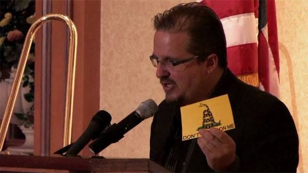 Rhodes made the remarks last week at a rightwing Gathering Of the Five Braincells in Tempe, Arizona, which was attended by Tea Party heroes like Rhodes, legendary Constitutional Sheriff and Obamacare survivor Richard "Women and Children in Front" Mack, and Arizona Senate President Andy Biggs, where the participants hooted and threw poop at an effigy of Barack Obama and prayed the E Plebnista until their eyeballs bled.