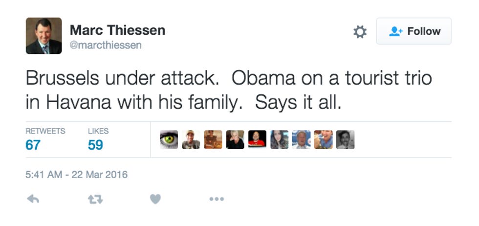 Obviously, it was the president's decision to travel to Cuba that directly led to the terrorist attacks in Brussels Tuesday morning. If you are this jackhole Fox News contributor and former derpwriter for President Gee Dubya.
