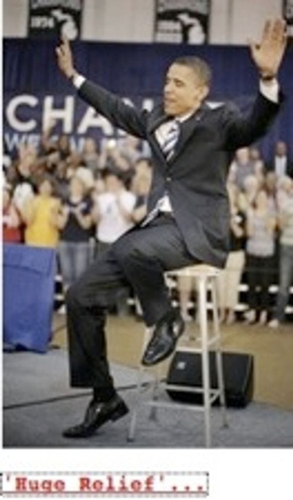 Here's your happy Barack Obama, now known as the Democratic Nominee for President. Thanks to Drudge for showing such a happy dancing fool. Now, the nation can heal. Except for the old white women. No healing for them. [ Drudge Report ]