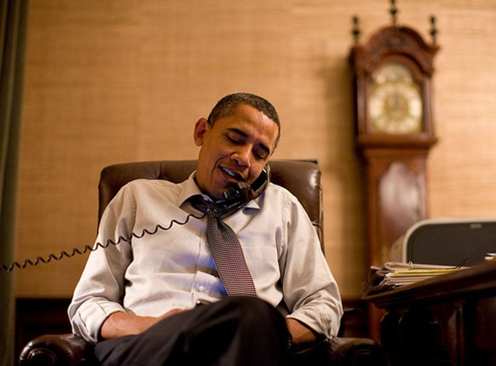 When the war is over, in the wee small hours, when your tie is loosened and you just want to have a cigarette and bullshit on the phone with another brother who likes his smokes, that's when you open the last bottle and putKind of Blueon the stereo and accidentally call John Boehner, because your dumb intern put him in the Rolodex under "colored guys." [ White House Flickr/Pete Souza ]