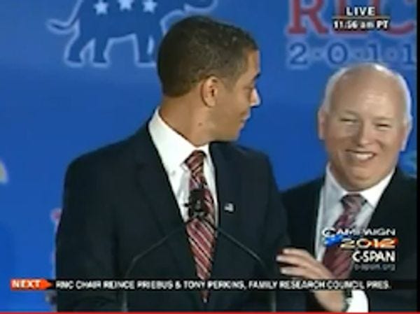 This makes it sound like the RLC organizers were offended that Brown made jokes about black people in hideously poor taste. But no, he actually got all the way through those "Obama is black" jokes -- including one about how they should rearrange the room according to pre-Civil Rights Act regulations, and everyone laughed -- before he used the joke that just tells itself, "Newt Gingrich's campaign is falling apart." AHAHA... see, we laughed at that one? This is when the audience finally turned on Reggie Brown. They booed him. DO NOT INSULT NEWT.
