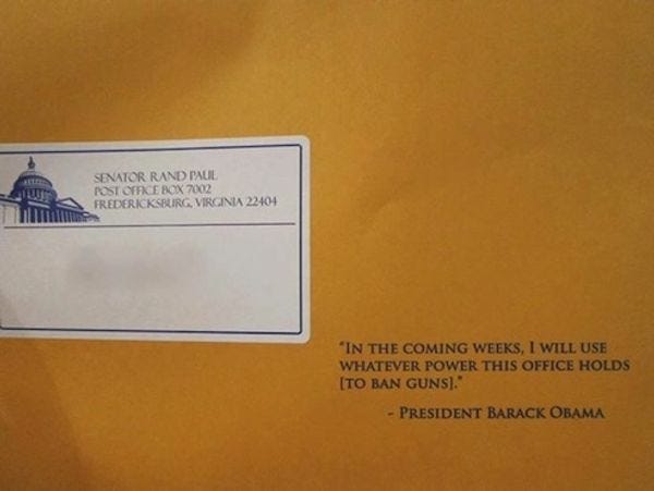Those letters you get in the mail that beg you to give money to feed blind children to the whales in disempoverished communities are called "direct mail." Political organizations also use direct mail to raise money and recruit members because it's weirdly effective, especially with people aged 65 and over. One such organization, the gun fetishist group National Association for Gun Rights, recently sent a mailer with a [fullashit] quote from our president, Barack Obama, on the outside of the envelope. It reads: