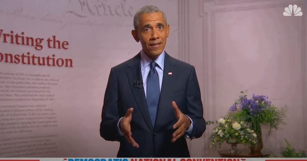 Meanwhile, the Democrats' addresses to the convention have met the moment. On Monday night, Michelle Obama pulled the fuckin' fire alarm, in a way we're not used to seeing her do. Last night, her husband former President Barack Obama did the same, in a way he doesn't do. And he was just saying that if you don't get over your shit and vote, America is over. (Which is a bit of an escalation from "DON'T BOO, VOTE," we think.)