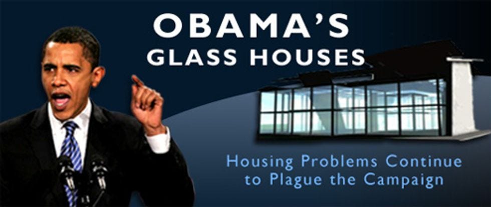The front page of GOP.com -- one of America's top sources of humor -- uses this graphic to represent "Obama's Glass Houses." It links to a scandalous item about how Obama locked into a modestly below-average mortgage rate because he had good credit. Oh no that is terrible oh no. We're mostly interested in the "glass house" illustration in this graphic, however. Is that what a Liberal's illegally-financed home looks like? All clear-like with fancy angles and such? Indeed, most Liberals live in subprime replicas of Dulles airport. [ GOP.com ]