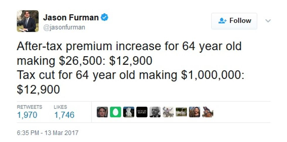 CBO expects that a 64-year-old who earns $20,000 would see her premiums rise from $1,700 to $14,600 under the Republican plan — a758 percent increase.She'd be expected to spend more than half her annual income on health insurance.