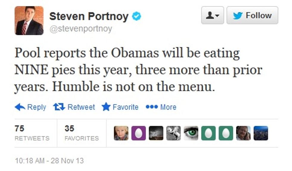 We guess Barack Obama must have mentioned God in his Thanksgiving proclamation this year, since we haven't seen a million angry blog posts bitching about it. (And there it is -- "we rise or fall as one Nation, under God" -- a blatant attempt to make up for his Gettysburg libel, too.*) Thankfully, even if they can't trot out the "war on religion" trope, wingnuts can still accuse the Obamas of being Louis XVI and Marie Antoinette, because as has been widely reported, the White House served nine types of pie at Thanksgiving this year -- or as the Daily Mail headline put it, "NINE different types of pie." This is of course the worst sort of hypocrisy, since 1) No other president has eaten well while some Americans were unemployed and 2) Michelle promotes healthy eating, but for a holiday dinner they didn't eat only kale and rice cakes.