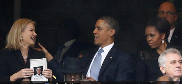 According to the never-wrong Enquirer , Michelle Obama's side eye seen around the world at Nelson Mandela's funeral was actual side eye and not just an awkward photo. When they returned to the White House, according to anonymous sources who are probably totally telling the truth, Michelle yelled all kinds of angry words, called the Danish prime minister a "tramp" (which is not a very sisterhood-is-powerful thing of her to say), and made Barack go sleep on the couch.
