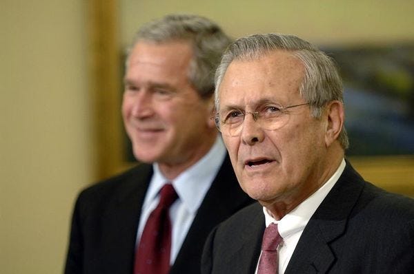Rumsfeld had a wrong, mendacious answer for everything. US troops were dying and getting grievously injured because their Humvees lacked even a pretense of armor? "You go to war with the Army you have — not the Army you might wish you have." Iraqis were looting museums and government buildings because the US had sent only enough troops to defeat the Iraqi military, not to secure the country? "Stuff happens." Besides, maybe all the disorder was just the exuberance of people who were freed from oppression, you ever think of that? They were maybe looting museums as a healthy sign of "pent-up feelings" against Saddam, even.