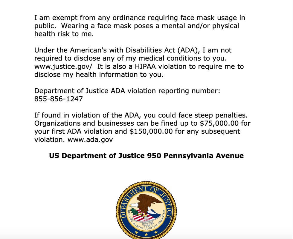 A similar card going around has pretty much the same text, with the added flair of claiming that the mask could pose a "mental health" risk to the wearer, and includes a Department of Justice seal at the bottom, just to make it look super official. Like the Department of Justice itself is going around handing these out to doofuses who want to schlep around Costco maskless.