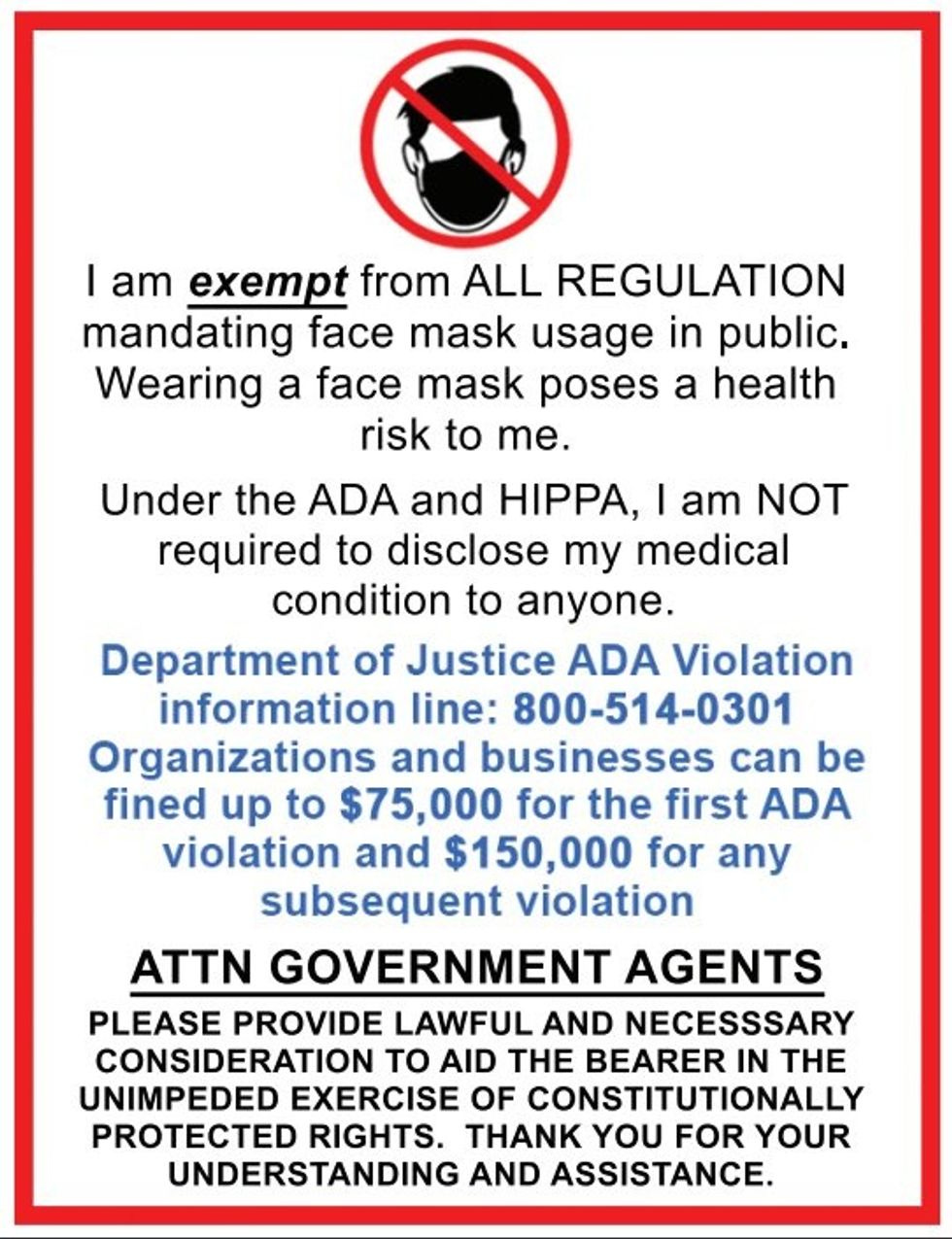 I am exempt from ALL REGULATIONS mandating face mask usage in public. Wearing a face mask poses a health risk to me.
