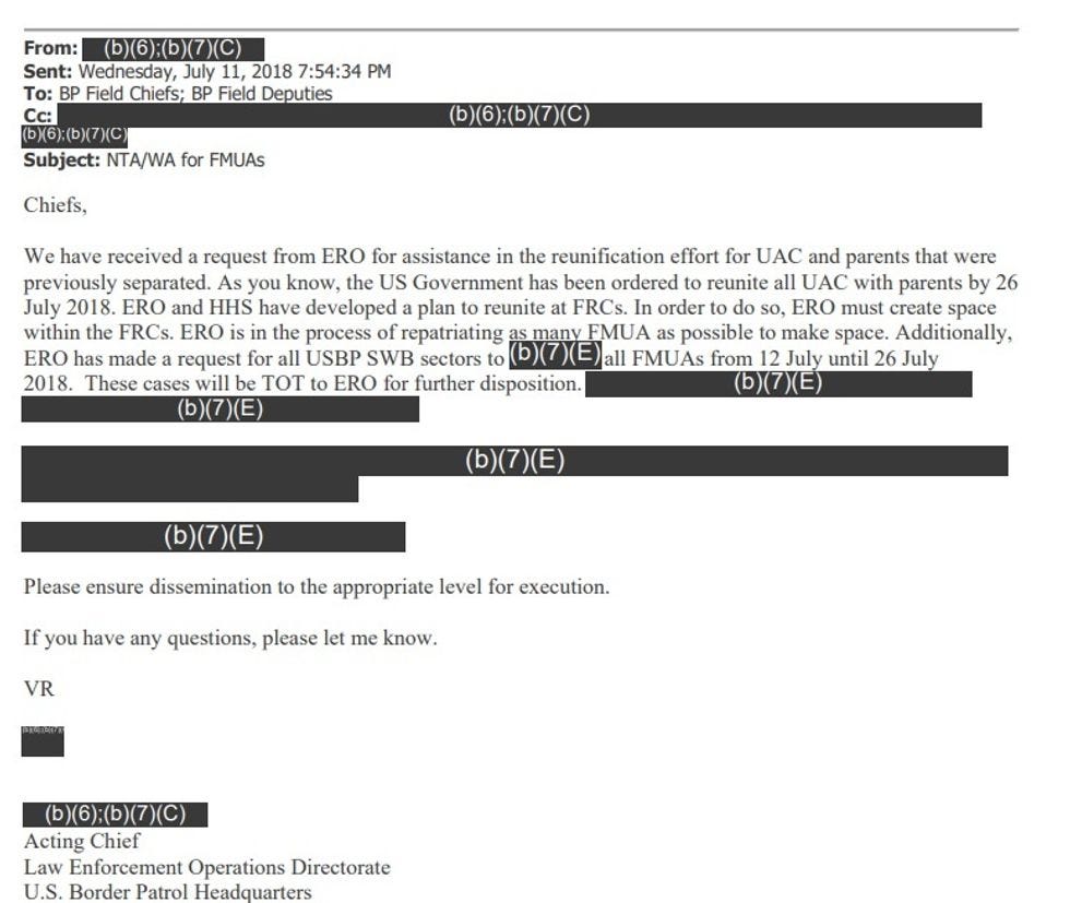 And as Columbo used to say, Oh yes, just one more thing: Among the documents released in the FOIA request, there's a happy little memo indicating that, even after a federal judge ordered families to be reunified on June 26, DHS was rushing in early July to deport families -- presumably those not explicitly covered by the order -- to "make space" in detention facilities for reunited families.