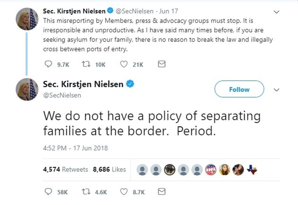 • And on June 17, she tweeted : "We do not have a policy of separating families at the border. Period."