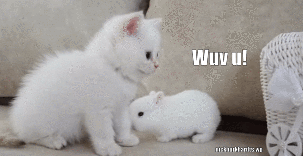 Anyway! For those who do not want to watch these videos, which I promise you are under no obligation to do, here is an insipid GIF of a kitten and a bunny. Can they haz cheezburger? No one knows! (I mean, except for whoever wrote the list of foods that cats cannot eat that is hanging on my fridge.)