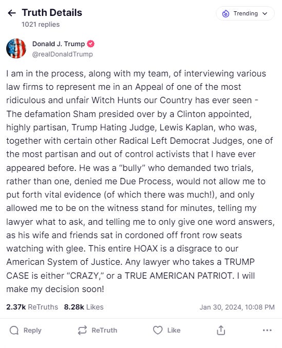 I am in the process, along with my team, of interviewing various law firms to represent me in an Appeal of one of the most ridiculous and unfair Witch Hunts our Country has ever seen - The defamation Sham presided over by a Clinton appointed, highly partisan, Trump Hating Judge, Lewis Kaplan, who was, together with certain other Radical Left Democrat Judges, one of the most partisan and out of control activists that I have ever appeared before. He was a “bully” who demanded two trials, rather than one, denied me Due Process, would not allow me to put forth vital evidence (of which there was much!), and only allowed me to be on the witness stand for minutes, telling my lawyer what to ask, and telling me to only give one word answers, as his wife and friends sat in cordoned off front row seats watching with glee. This entire HOAX is a disgrace to our American System of Justice. Any lawyer who takes a TRUMP CASE is either “CRAZY,” or a TRUE AMERICAN PATRIOT. I will make my decision soon!
